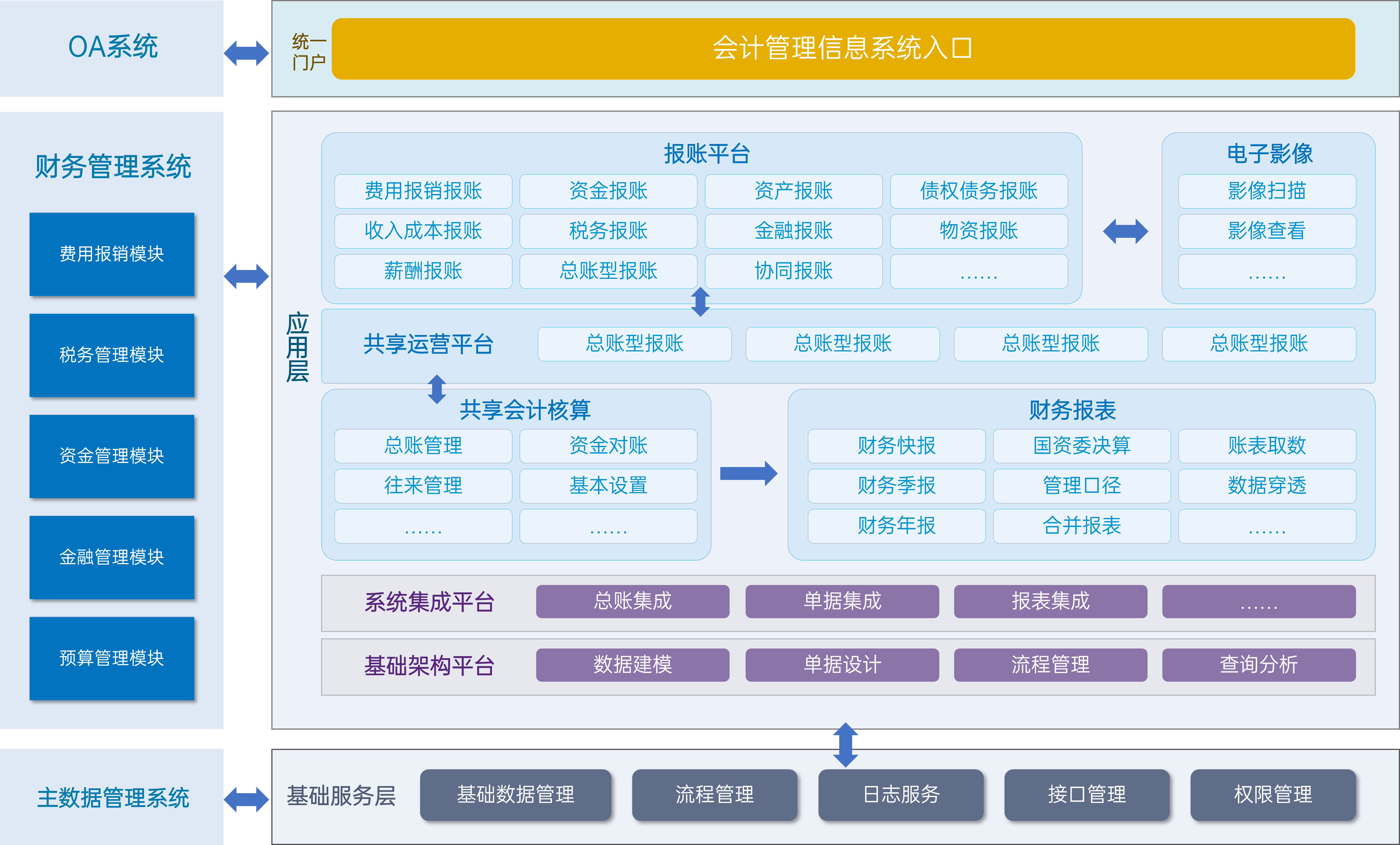 1. 报账平台:作为业务数据的接入口,前端对接财务管理、主数据等业务系统,实现各类业务报账单的对接转换及统一处理。